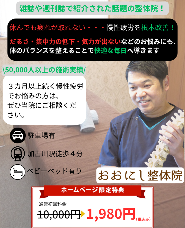 当院では、ただの疲れやすさではなく、深い疲労感を根本から解消するための施術を提供しています。病院で「年齢のせい」と言われたり、マッサージや薬では改善しなかった方も、ぜひ一度ご相談ください。