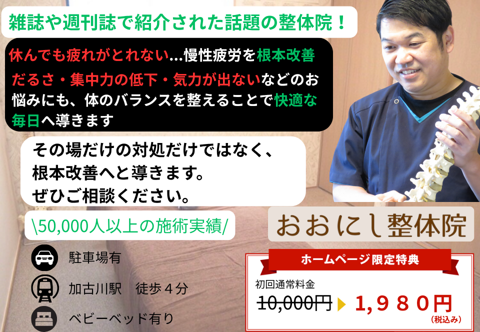 ツライ痛み・不調でお悩みでしたら、加古川市に整体院を持つ大西先生の施術を受けてみてください!