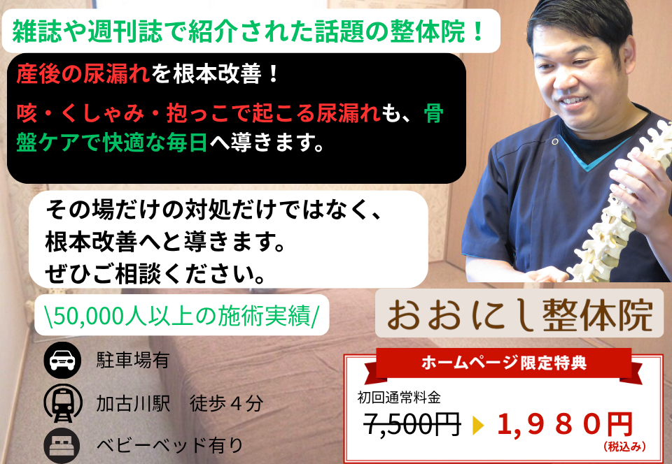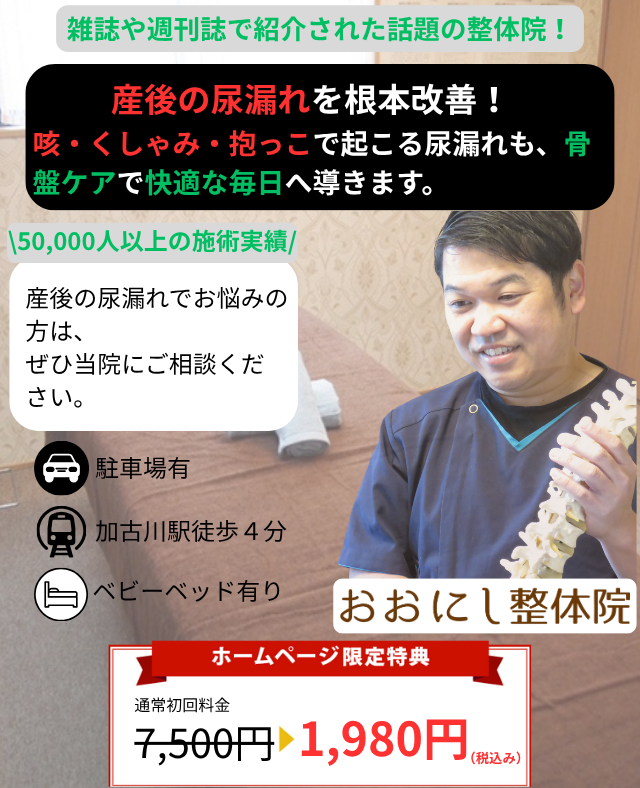 産後の骨盤矯正でご来院される方のお悩みで多いのが尿漏れです。