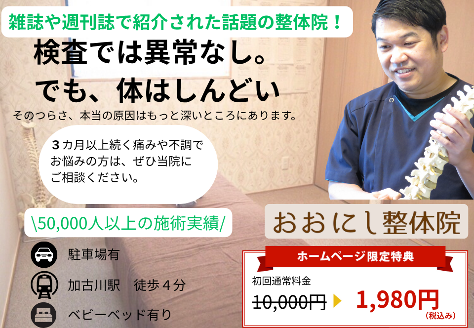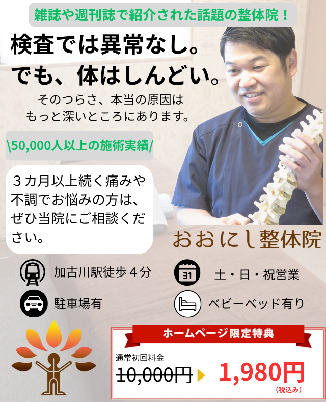 ツライ痛み・不調でお悩みでしたら、加古川市に整体院を持つ大西先生の施術を受けてみてください!