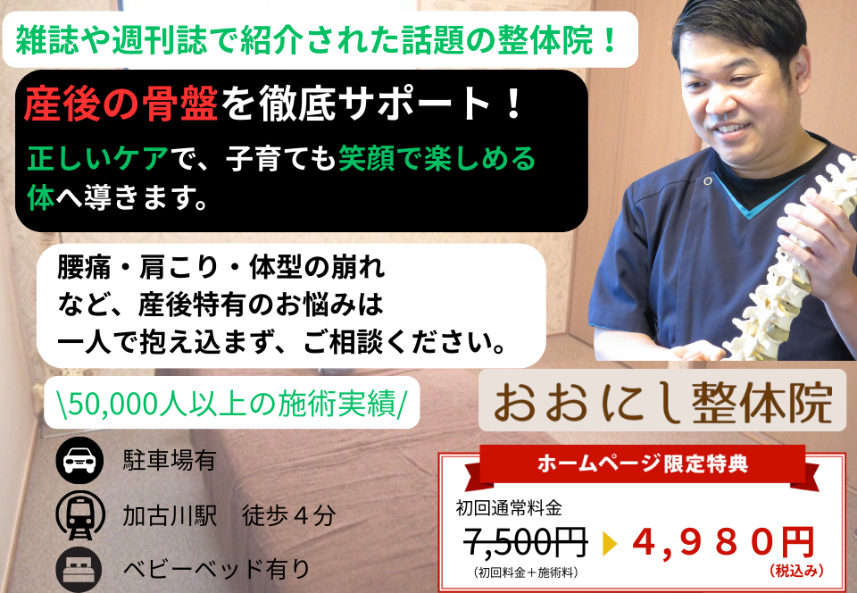 二人目の出産後から腰痛がひどく、子どもの抱っこもとてもきつい日々が続き、3人目の出産後には一度骨盤を正しい位置にもどしたいと思って来させていただきました。