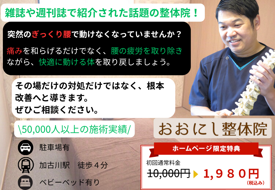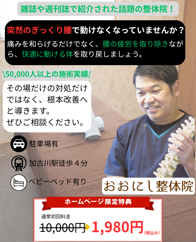 ツライ痛み・不調でお悩みでしたら、加古川市に整体院を持つ大西先生の施術を受けてみてください!
