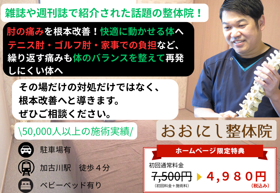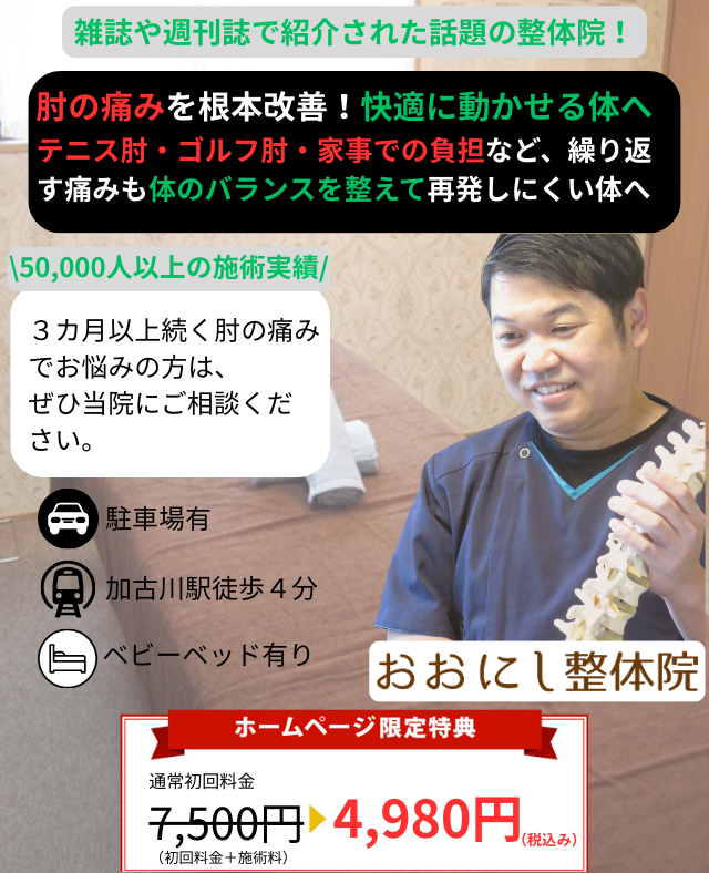 私は子供を抱っこする時や、家事をしている時に肘に強い痛みを感じ、病院でも湿布や痛み止めを処方されるだけで改善しませんでした。