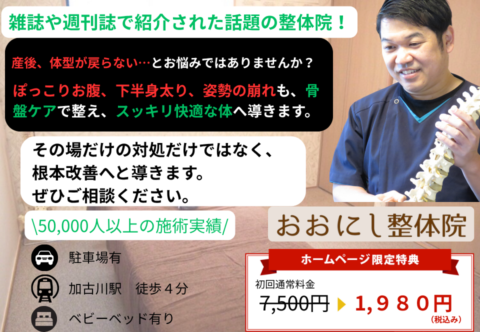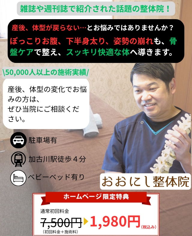 2人目出産後、この機会にしっかり骨盤を元に戻したいと思い、おおにし整体院で骨盤矯正をお願いする事にしました。