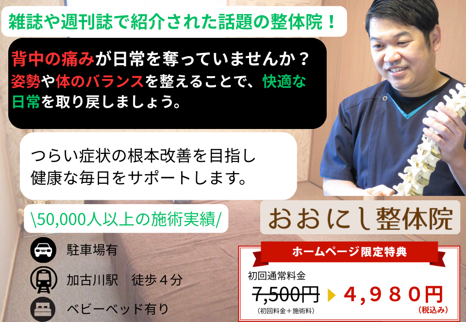 ツライ痛み・不調でお悩みでしたら、加古川市に整体院を持つ大西先生の施術を受けてみてください!