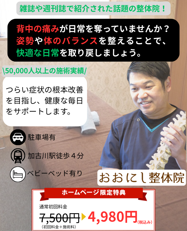 背中の痛みをなくし、快適な日常生活を取り戻すために、ぜひ一度ご相談ください。