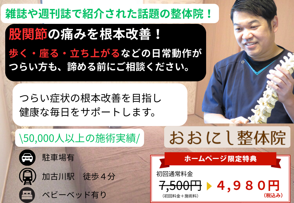 加古川市・40代女性 長年悩んでいた股関節の痛みが、ついに改善しました!
